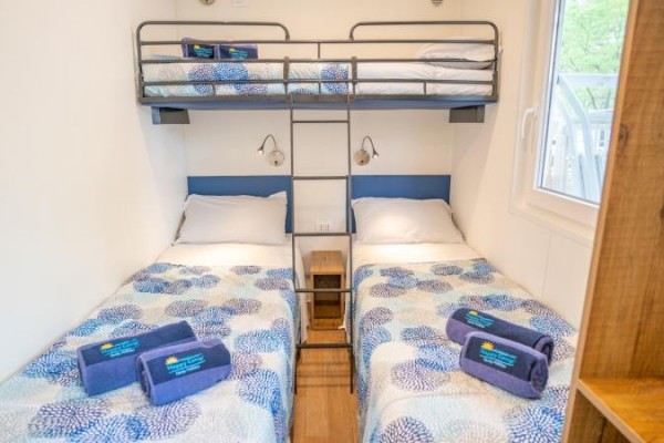 M4 RELAX: (maks. 4 osób, 25 m2) sypialnia z łóżkiem dwuosobowym, sypialnia z dwoma łóżkiami, pokój dzienny z miejscem do siedzenia i boksem kuchennym, prysznic+WC, klimatyzacja. Częściowo kryty drewniany taras z meblami ogrodowymi i grillem.
