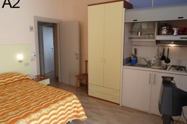 A2: (maks. 2 osoby) studio (jedno pomieszczenie) z łóżkiem dwuosobowym (może być rozkładane), boks kuchenny, kuchenka mikrofalowa.