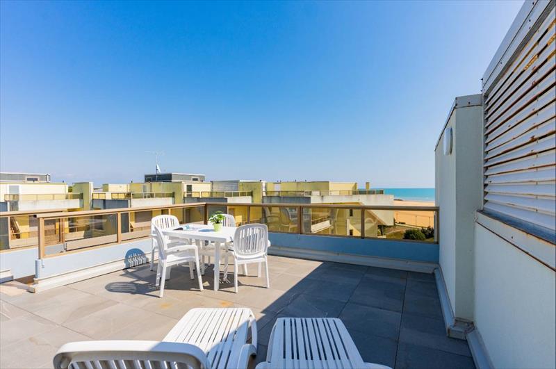 C6-2: (maks. 6 osób) (na poddaszu) dwie sypialnie w każdej dwa łóżka, pokój dzienny z rozkładanym łóżkiem dwuosobowym oraz boksem kuchennym, duży taras do opalania, boczny widok na morze.
