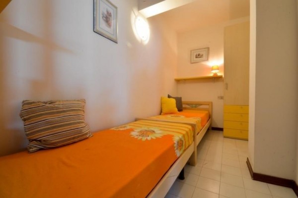 C5: (maks. 5 osób) (na parterze) sypialnia z łóżkiem dwuosobowym, sypialnia z dwoma łóżkami, pokój dzienny z rozkładanym łóżkiem jednoosobowym i boksem kuchennym, ogródek.