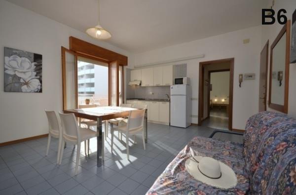 B6: (maks. 6 osób) sypialnia z łóżkiem dwuosobowym i dwoma łóżkami, pokój dzienny z rozkładanym łóżkiem dwuoosobowym, boks kuchenny. Balkon.