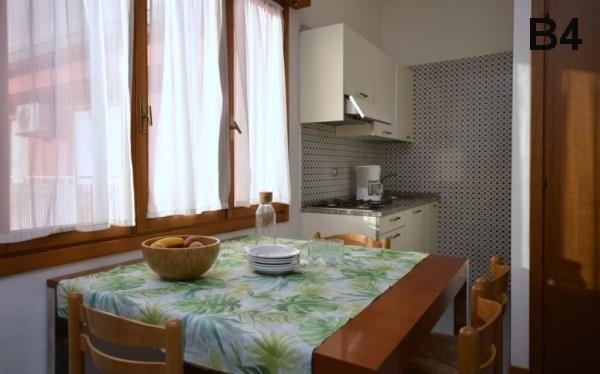 B4: (maks. 4 osoby) sypialnia z łóżkiem dwuosobowym (i trzecim łóżkiem), pokój dzienny z rozkładanym łóżkiem dwuoosobowym (lub łóżkiem pojedyńczym), boks kuchenny. Bez balkonu.