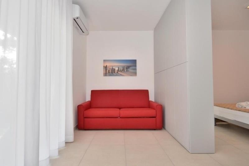 A4: (maks. 4 osoby) studio (jednopokojowe) z wnęką z łóżkiem małżeńskim, aneksem kuchennym. Rozkładana sofa.