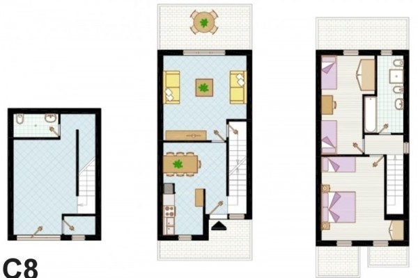 | C8: (maks. 8 osób, trzypoziomowy apartament) na poziomie ulicy - garaż, składzik, prysznic+WC. Podwyższony parter (poziom ogrodu) – boks kuchenny i jadalnia, pokój dzienny z dwoma rozkładanymi łóżkami, taras, kominek i bezpośrednie wejście do ogrodu. 1. piętro - sypialnia z trzema łóżkami, sypialnia z łóżkiem piętrowym i jednym pojedynczym łóżkiem, prysznic+WC, 2x balkon. | ||||||||||||||||||||||||||||||||||||||||||||||||||||||||||||||||||||||||||||||||||||||||||||||||||||||||||||||||||||||||||||||||||||||||||||||||||||||||||||||||||||||||||||||||||||||||||||||||