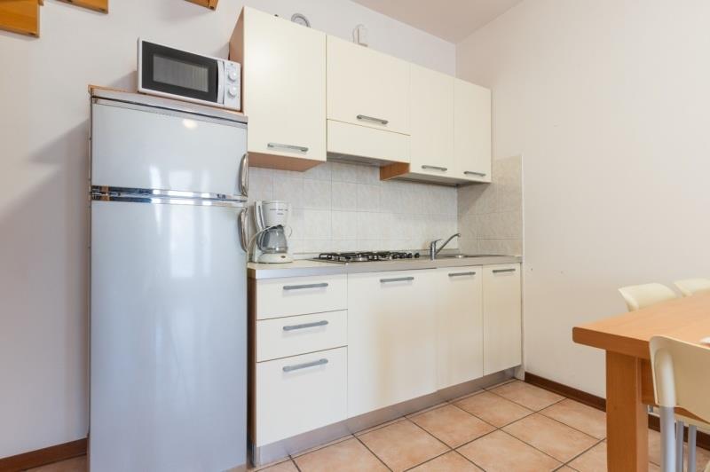 | B5: (maks. 5 osób, dwupoziomowy apartament) na parterze - pokój dzienny z rozkładanym łóżkiem dwuosobowym oraz boksem kuchennym, taras i mały ogródek. Na piętrze - sypialnia z trzema łóżkami, prysznic+WC, balkon. |
