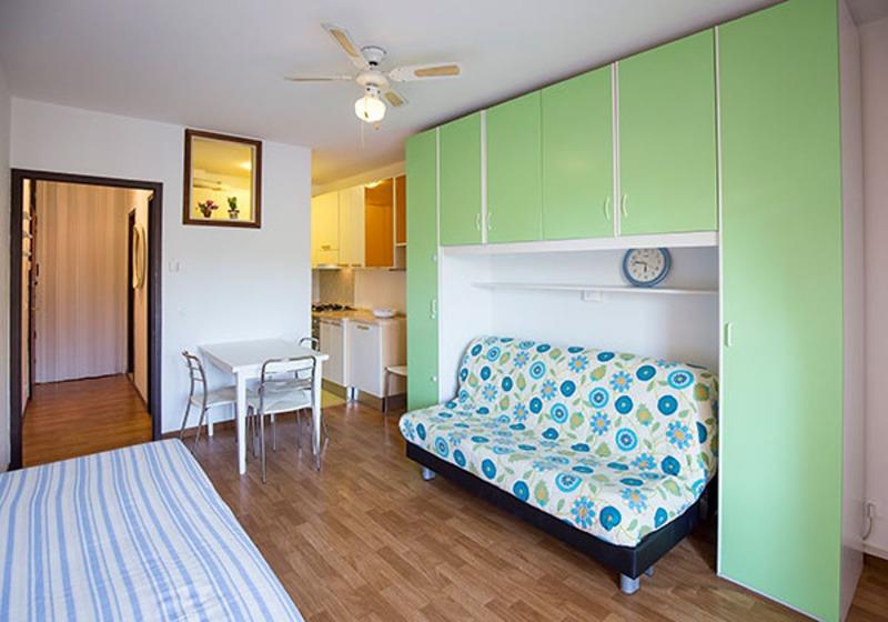 A4: (maks. 4 osoby) studio (jedno pomieszczenie) z rozkładanym łóżkiem dwuosobowym oraz dwoma łóżkami rozkładanymi, boks kuchenny.