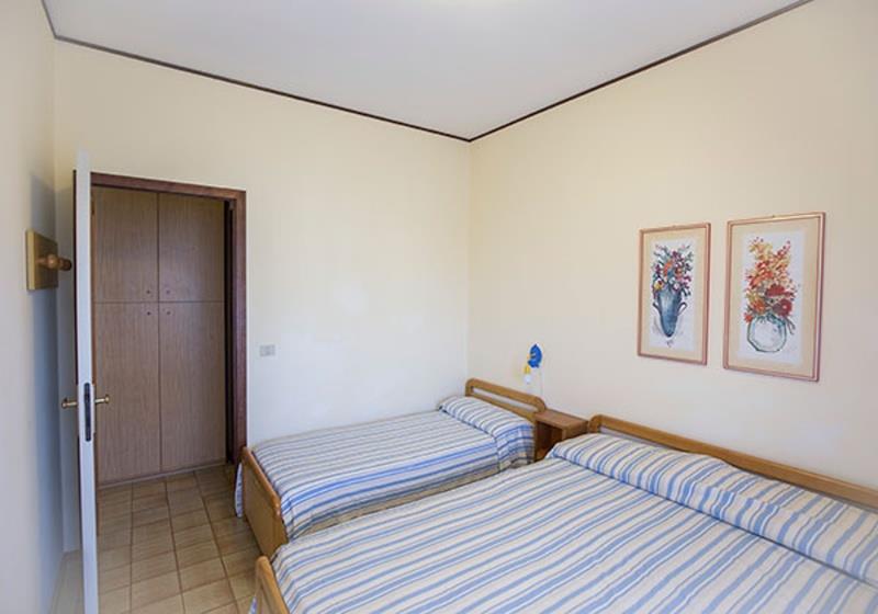 C6: (maks. 6 osób) sypialnia z dwoma łóżkami, mała sypialnia z łóżkiem piętrowym i z oknem do sąsiedniej sypialni, pokój dzienny z rozkładanym łóżkiem dwuosobowym oraz boksem kuchennym, balkon.