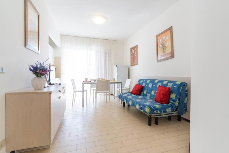 B4-2: (maks. 4 osoby) sypialnia z dwoma łóżkami, pokój dzienny z rozkładanym łóżkiem dwuosobowym oraz boksem kuchennym. Widok na basen.