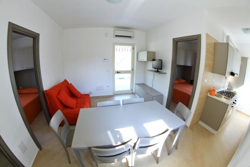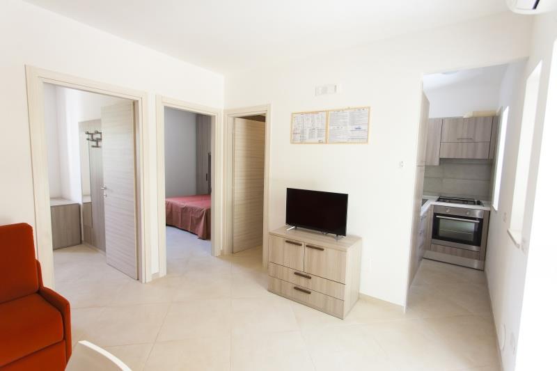 D6/8 SUPERIOR PLUS: (60 m2, maks. 8 osób, parter) nowe apartamenty - dwie sypialnie w każdej łóżko dwuosobowe, mniejsza sypialnia z łóżkiem piętrowym, pokój dzienny z rozkładanym łóżkiem dwuosobowym, 2x prysznic+WC, TV, klimatyzacja, taras z pergolą i meblami ogrodowymi. Dostawka dla 7. i 8. osoby (na żądanie podczas rezerwacji, za opłatą).