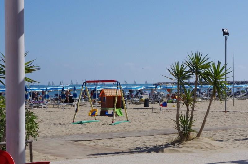 Plaża: piaszczysta z łagodnym wejściem do morza, serwis plażowy (1 parasolka + 2 fotele/ pokój) objęty w cenie pobytu (do 30/6 i po 1/9, od 4. rzędu).