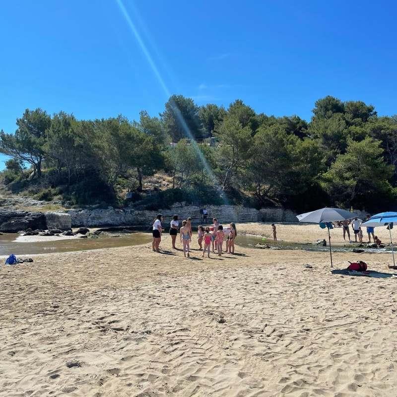 Plaża: piaszczysta, ograniczona skalistymi cyplami. Serwis plażowy (1 parasolka+2 fotele) można dokupić na miejscu (ok. 60 €/ czerwiec, wrzesień, 90 €/ lipiec, 120 €/ sierpień).