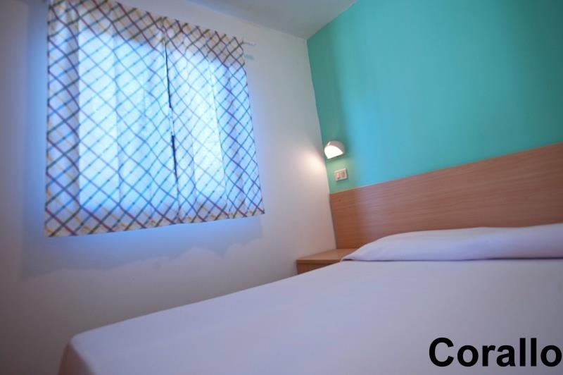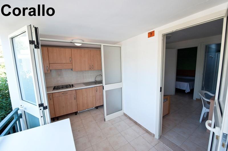 B3/4 CORALLO: (33 m2, maks. 3-4 osoby) (bungalow) sypialnia z łóżkiem dwuosobowym, pokój dzienny z rozkładanym łóżkiem dwuosobowym, boks kuchenny na krytej werandzie.