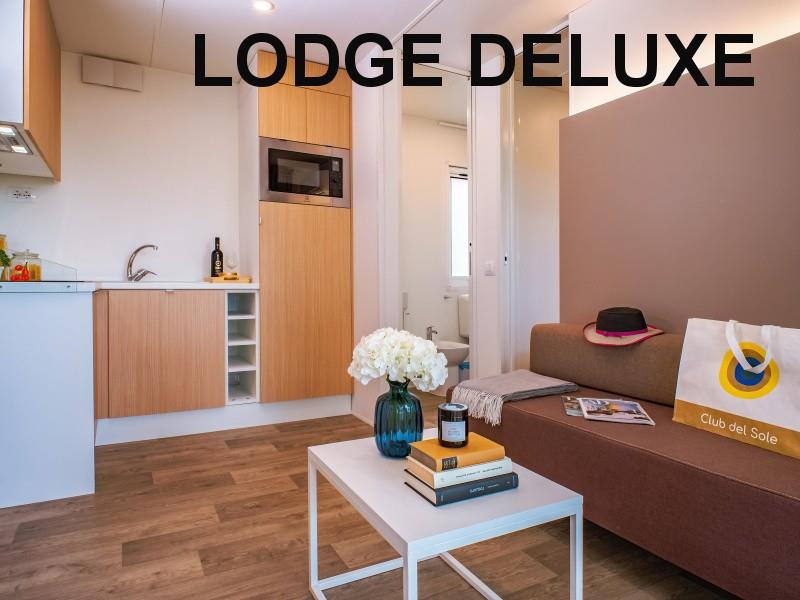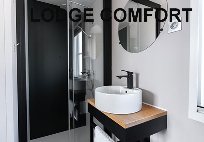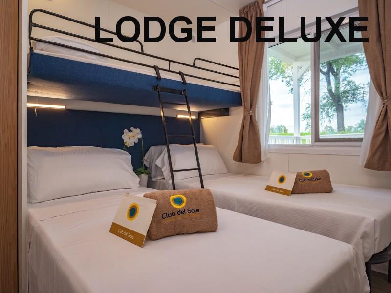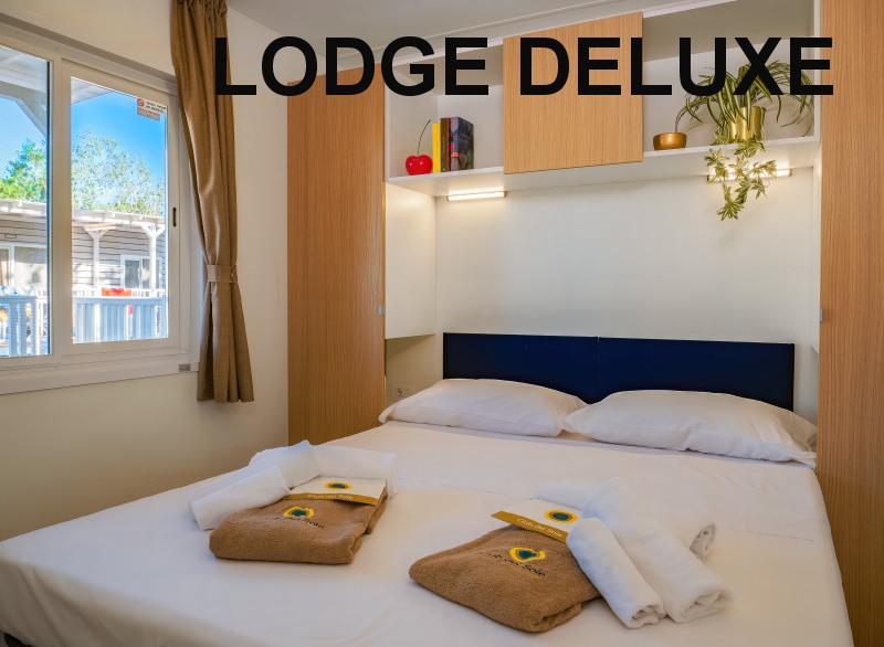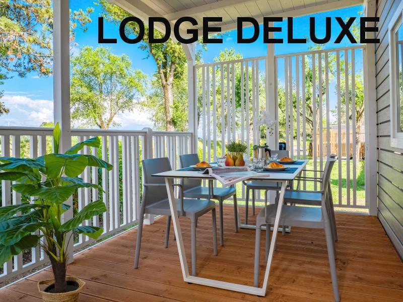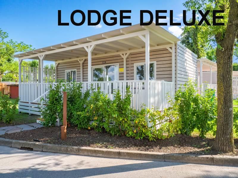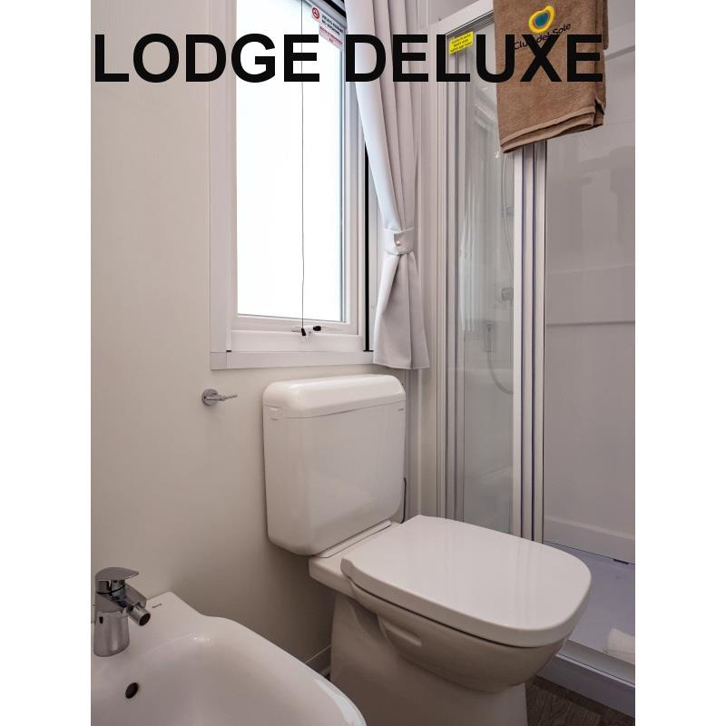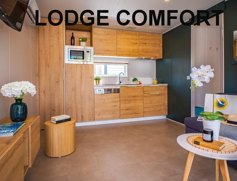domek mobilny LODGE SUPERIOR: (maks. 4 osoby, ok. 32 m2) sypialnia z łóżkiem małżeńskim, sypialnia z dwoma łóżkami, salon z aneksem kuchennym, zmywarka naczyń, mikrofalówka, 2 łazienki + WC, taras.