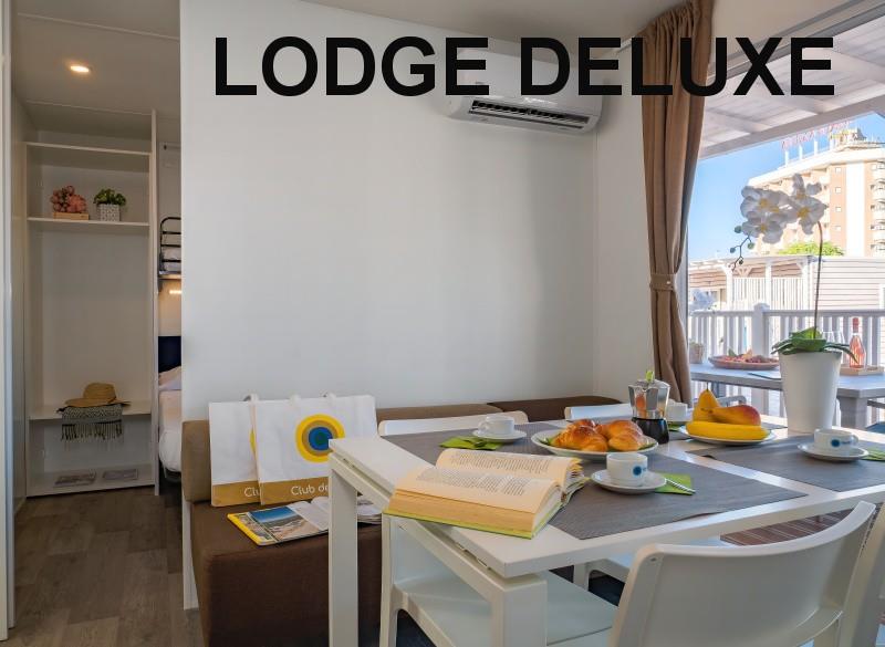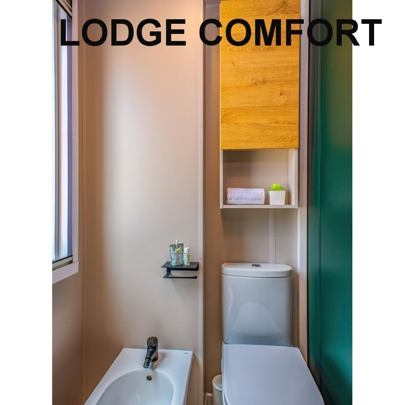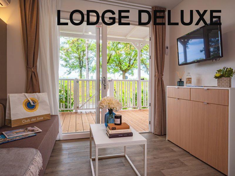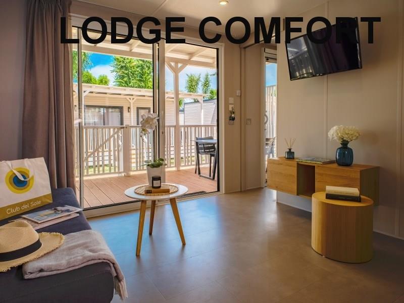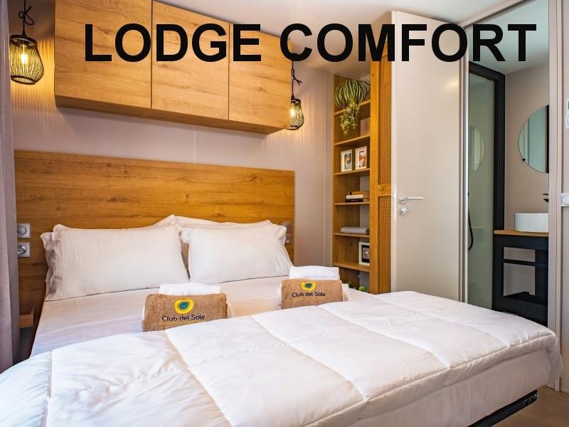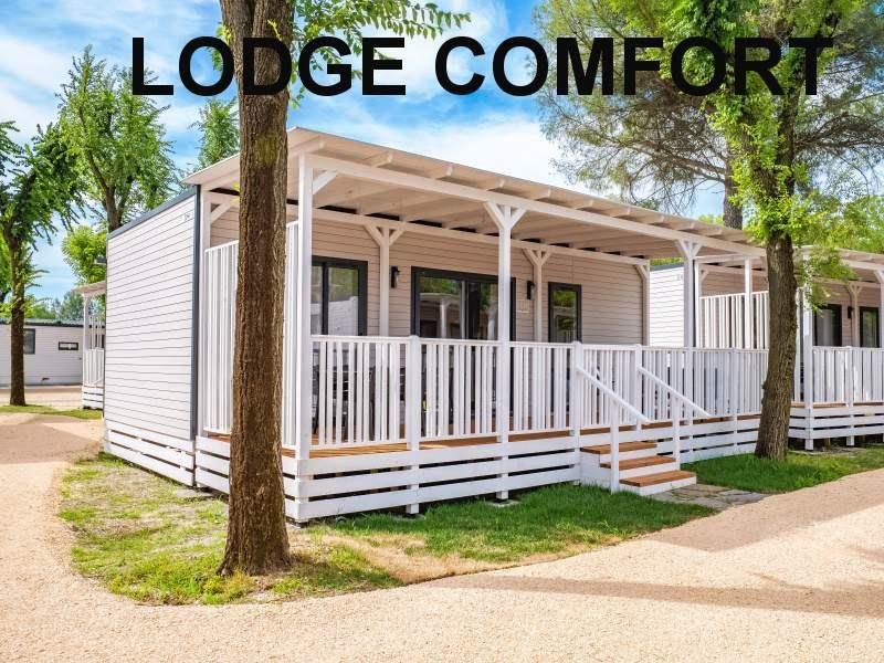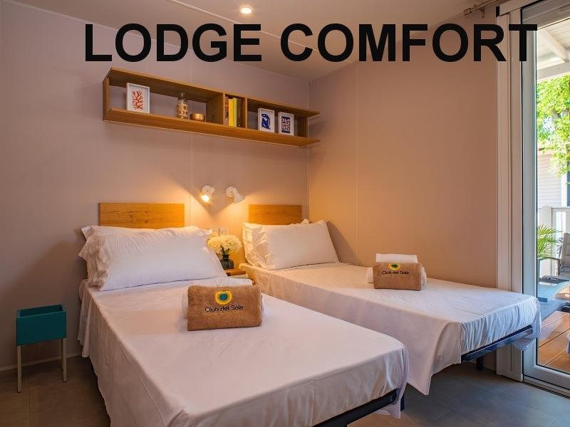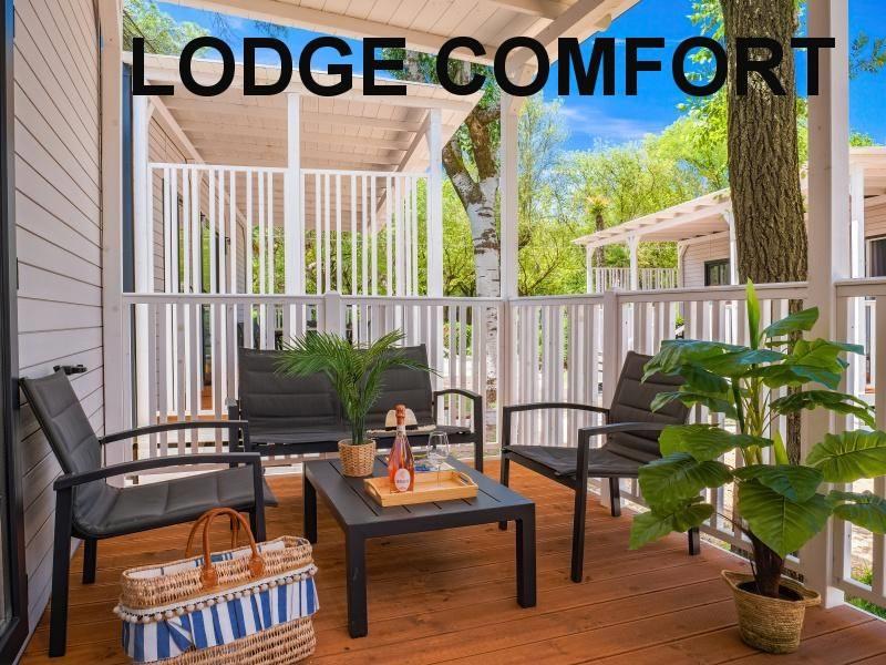 domek mobilny LODGE SUPERIOR: (maks. 4 osoby, ok. 32 m2) sypialnia z łóżkiem małżeńskim, sypialnia z dwoma łóżkami, salon z aneksem kuchennym, zmywarka naczyń, mikrofalówka, 2 łazienki + WC, taras.