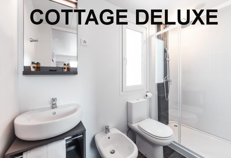 chalet COTTAGE DELUXE MAXI: (maks. 4 osoby, ok. 33 m2) sypialnia z łóżkiem małżeńskim, sypialnia z dwoma łóżkami, salon z aneksem kuchennym, zmywarką, 2x prysznic + WC, taras.