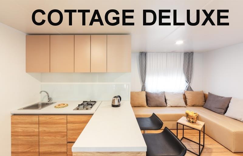 chalet COTTAGE DELUXE: (maks. 2 osoby, ok. 33 m2) sypialnia z łóżkiem małżeńskim, przestronny salon z aneksem kuchennym, łazienka+WC, taras.