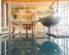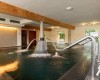 - basen połączony z basenem zewnętrznym, idealne dla tych, którzy kochają pływać, z widokiem na ogromne okno, które daje wrażenie zanurzenia się w zieleni ogrodu.podczas lata, system kontroli temperatury otoczenia uruchamia aktywację markiz, które umożliwiają optymalizację wewnętrznego zużycia energii. Oświetlenie nocne obszaru powstaje dzięki odbiciom przekazywanym przez lustra zawieszone w powietrzu, które czerpią światło emitowane przez diody LED zamontowane wzdłuż ścian i sufitów całego obszaru.;