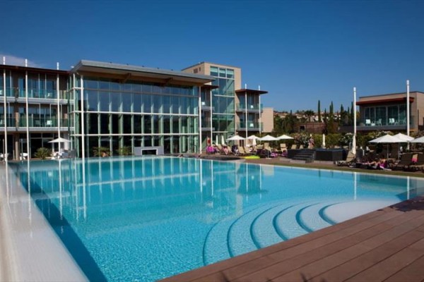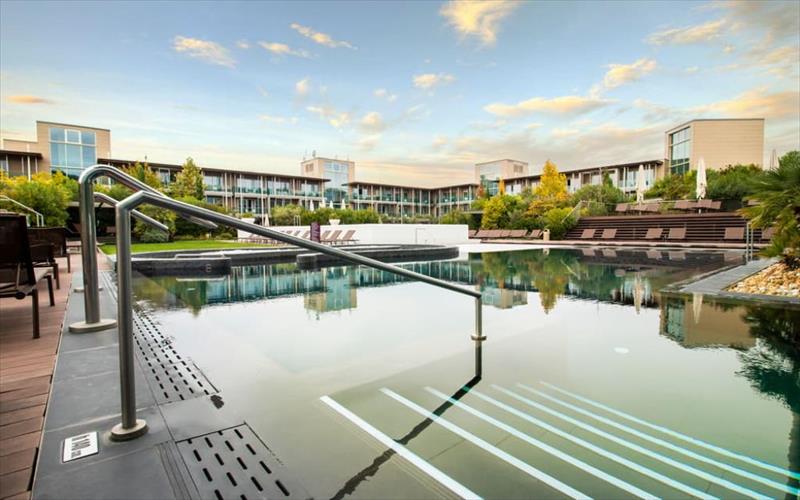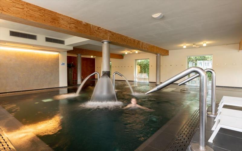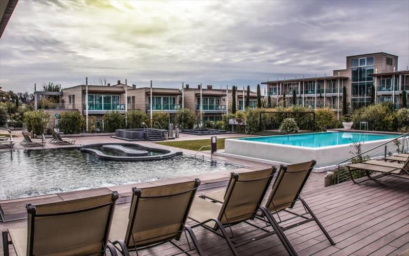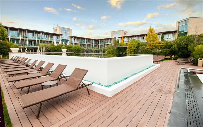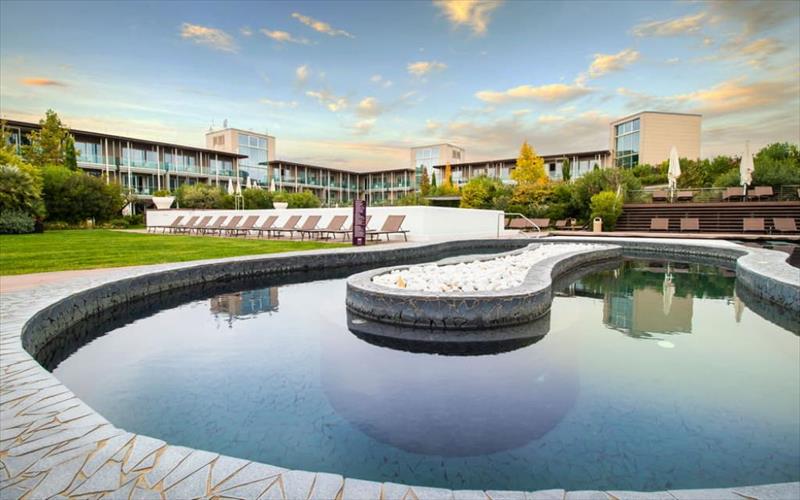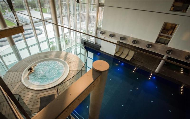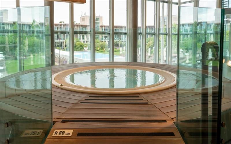 Ogromny dziedziniec wewnątrz hotelu poświęcony jest doświadczeniom wodnym. Środowisko jasności i przejrzystości, którego bohaterami są osiem naturalnych basenów z wodą mineralną, z czego cztery są wewnętrzne i cztery zewnętrzne, o właściwościach terapeutycznych, które zapewniają chwile głębokiego dobrostanu.