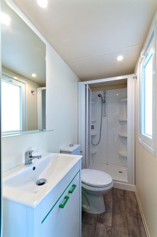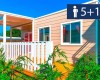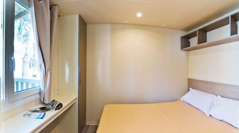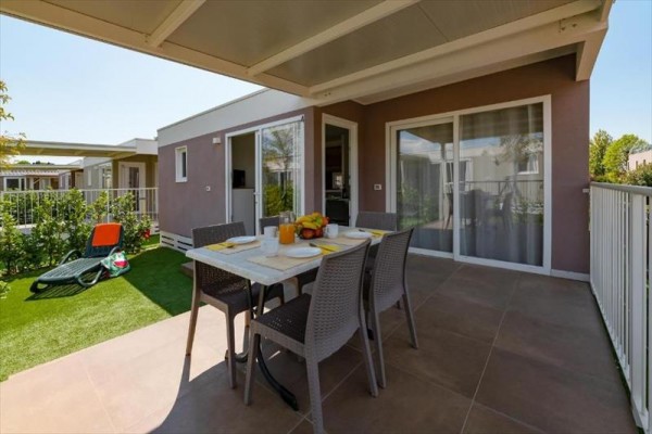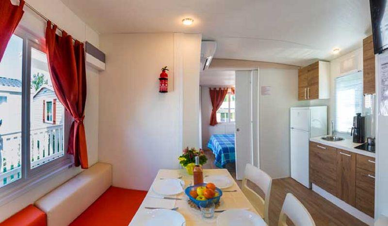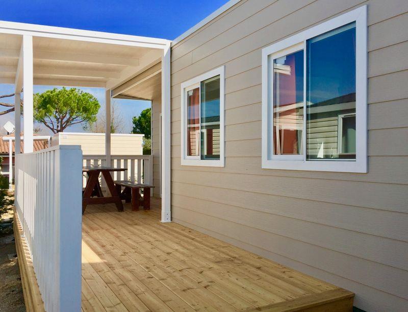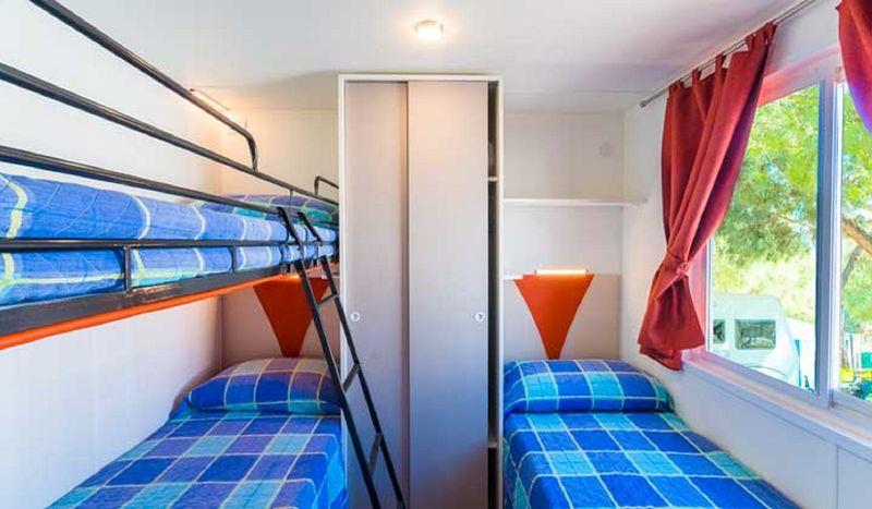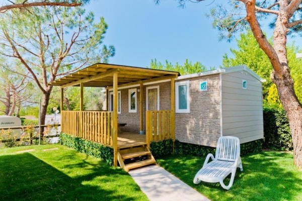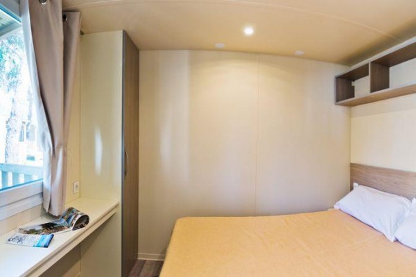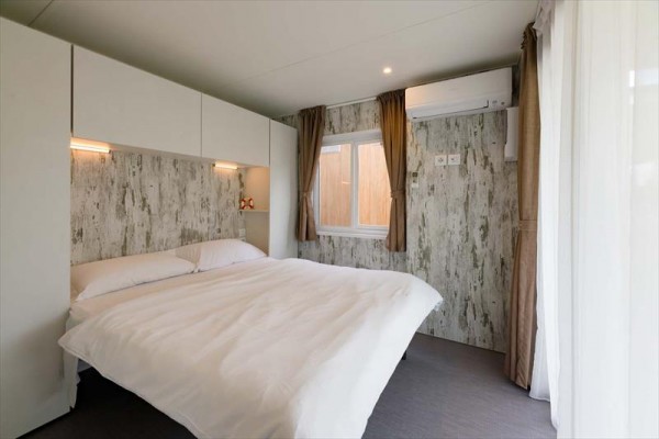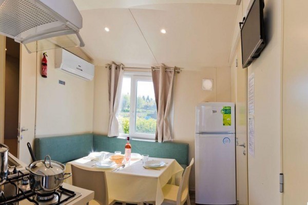 Domki mobilne Village: ok. 31 m2. Wyposażone w prysznic, suszarkę do włosów, telewizję satelitarną, sejf, lodówkę, klimatyzację, Wi-Fi, taras. 1 łóżko podwójne 190 cm x 150 cm, 3 łóżka pojedyncze 190 cm x 80 cm każde. Łóżeczko dziecięce | Suszarka do włosów | Klimatyzacja | Aneks kuchenny | Lodówka | Telewizja satelitarna | Prysznic | Sejf | Wi-Fi