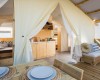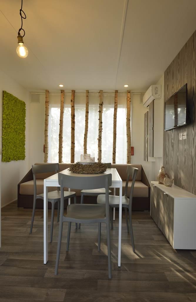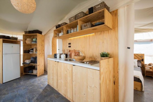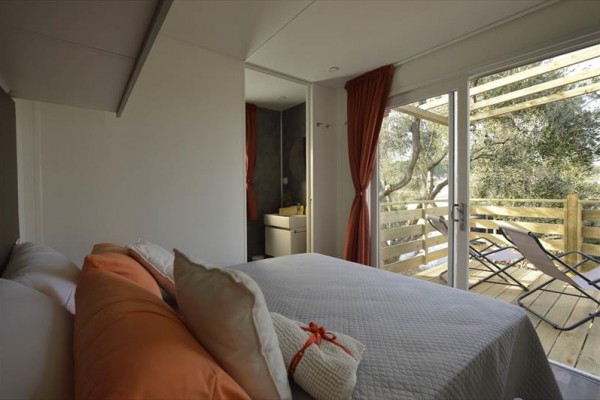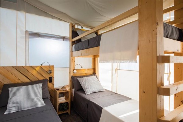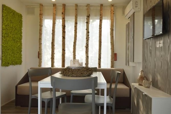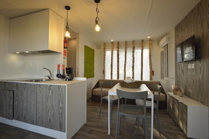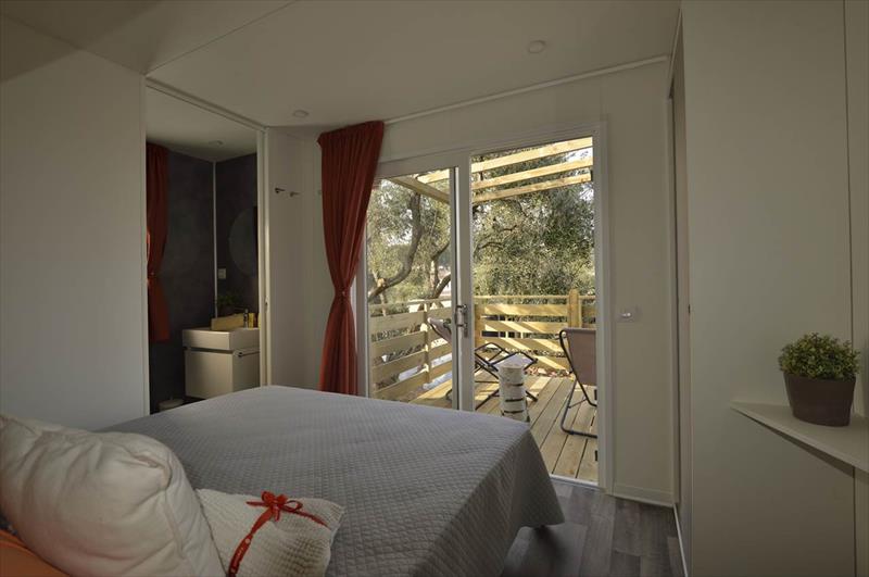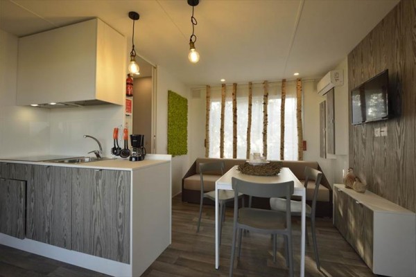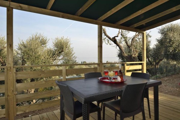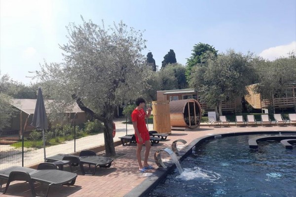 Zakwaterowanie: NAMIOT: Namiot Safari o powierzchni ok. 28 m2, odpowiedni dla 5 osób, składa się z jednej sypialni z łóżkiem podwójnym oraz drugiej z łóżkiem piętrowym i łóżkiem pojedynczym. Łazienka wyposażona jest w toaletę, umywalkę i prysznic. Kuchnia wyposażona jest w płytę indukcyjną, lodówkę, kuchenkę mikrofalową, ekspres do kawy lub czajnik oraz wentylator. Brak klimatyzacji. Prywatna, umeblowana weranda. Zwierzęta NIE są akceptowane. Łóżka chowane w ścianie są przeznaczone dla dzieci do 6 lat (20 kg). MHTOP: TOP HILL Domek mobilny TOP HILL może pomieścić do 5 osób. Domek mobilny o powierzchni ok. 37 m2 oferuje funkcjonalne i komfortowe przestrzenie. W skład wyposażenia wchodzą: salon z klimatyzacją, aneksem kuchennym i sofą, 1 sypialnia dwuosobowa, 1 sypialnia z 3 łóżkami pojedynczymi (w tym łóżkiem piętrowym) oraz 2 łazienki z toaletą, prysznicem i umywalką. Do dyspozycji Gości jest zadaszona weranda (8 x 2,5 m). W cenie zawarte jest jedno miejsce parkingowe. Zwierzęta NIE są akceptowane. Łóżka chowane w ścianie są przeznaczone dla dzieci do 6 lat (20 kg). MHLV: MH Garda Terrace z widokiem na jezioro (ok. 35 m2): Domek mobilny LAKE VIEW TERRACE (ok. 35 m2) może pomieścić maksymalnie 5 osób i posiada wygodną werandę, z której można podziwiać najlepszy widok. Dom składa się z salonu z klimatyzacją, aneksu kuchennego z płytą indukcyjną i zmywarką, sofy, 1 sypialni dwuosobowej, 1 sypialni z 3 łóżkami pojedynczymi (w tym jednym łóżkiem piętrowym) oraz 2 łazienek z toaletą, prysznicem i umywalką. W cenie jest jedno miejsce parkingowe. Zwierzęta NIE są akceptowane. Łóżka chowane w ścianie są przeznaczone dla dzieci do 6 lat (20 kg). MH8: MH Garda Spa z widokiem na jezioro (ok. 35 m2): Domek mobilny LAKE VIEW ze SPA (35 m2) w uprzywilejowanej, cichej i zacienionej lokalizacji oferuje wspaniały widok na jezioro, który można podziwiać również z bardzo wygodnego, prywatnego jacuzzi. W skład wyposażenia wchodzą: salon z klimatyzacją, aneks kuchenny z płytą indukcyjną i zmywarką, sofa, 1 sypialnia dwuosobowa, 1 sypialnia z 3 łóżkami pojedynczymi (w tym jednym łóżkiem piętrowym) oraz 2 łazienki z toaletą, prysznicem i umywalką. W cenie jedno miejsce parkingowe. Zwierzęta NIE są akceptowane. Łóżka chowane w ścianie są przeznaczone dla dzieci do 6 lat (20 kg).