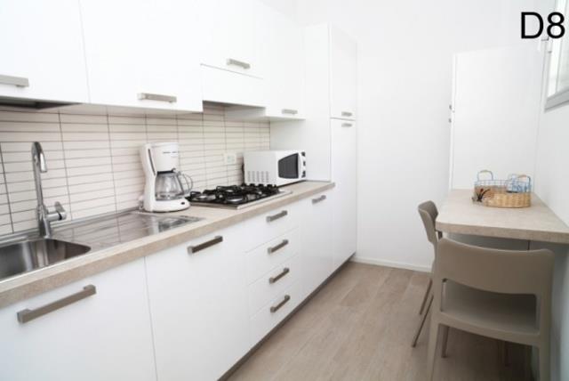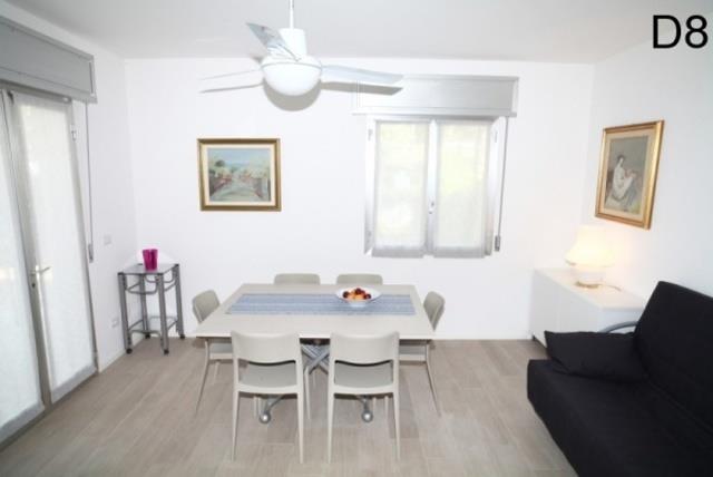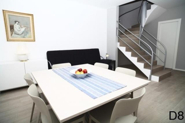 D8: (maks. 8 osób, dwupoziomowy apartament) na parterze - pokój dzienny z boksem kuchennym i rozkładanym łóżkiem dwuosobowym, prysznic+WC, ogródek. Na piętrze - dwie sypialnie w każdej łóżko dwuosobowe, sypialnia z dwoma łóżkami, prysznic+WC, balkon.