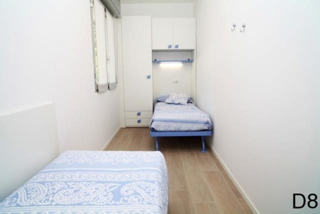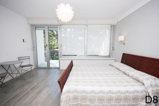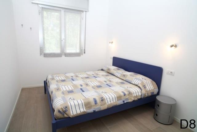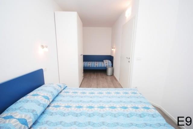 D9: (maks. 8 osób, dwupoziomowy apartament) na parterze - sypialnia z łóżkiem pojedynczym, pokój dzienny z boksem kuchennym i rozkładanym łóżkiem dwuosobowym, prysznic+WC, taras i ogródek. Na piętrze - sypialnia z łóżkiem dwuosobowym, sypialnia z łóżkiem dwuosobowym i łóżkiem pojedynczym, prysznic+WC, balkon.