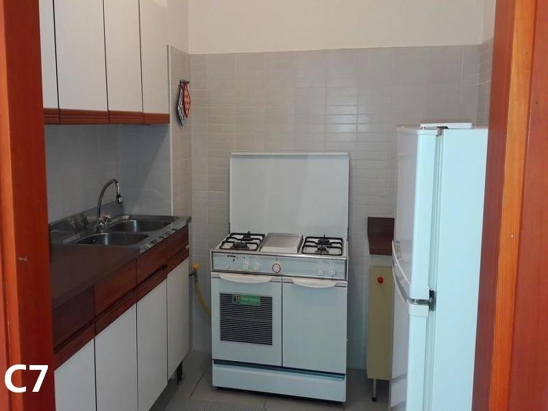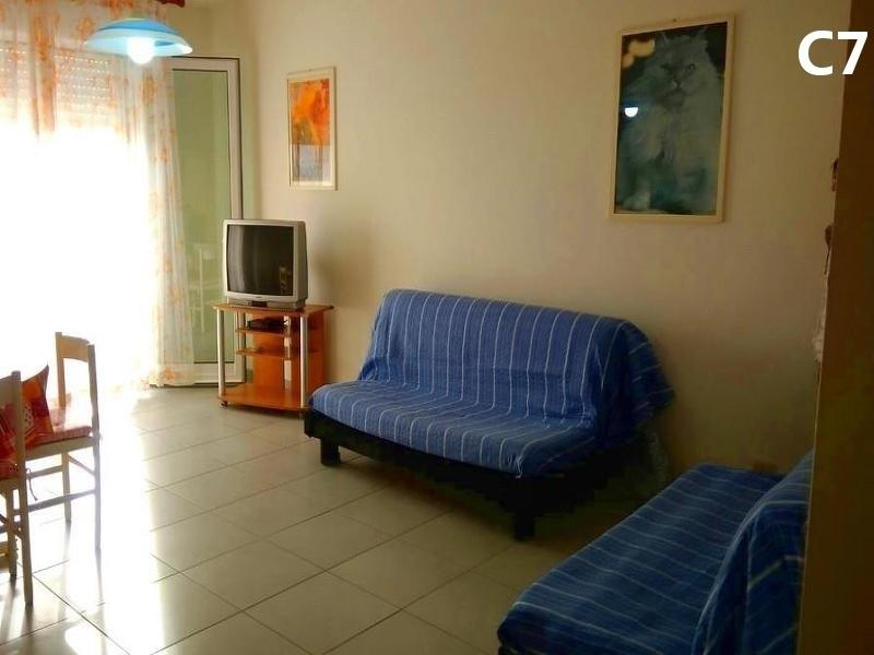 C7: (maks. 7 osób) sypialnia z dwoma łóżkami, sypialnia z trzema łóżkami, przestrzenny pokój dzienny z rozkładanym łóżkiem dwuosobowym i boksem kuchennym, 2x balkon (jeden z widokiem na morze, jeden z widokiem na drogę).