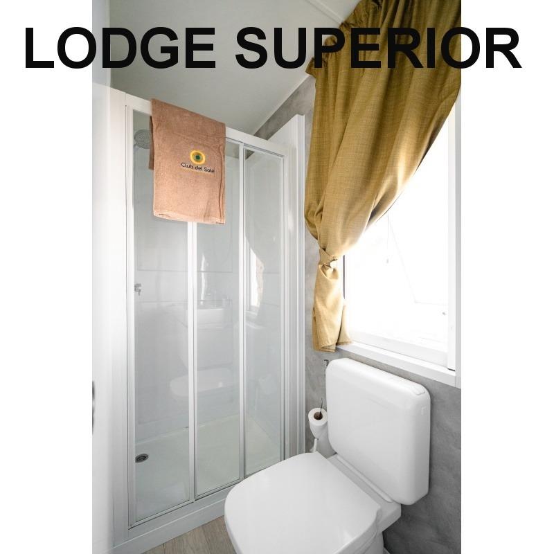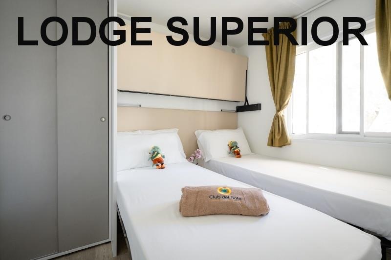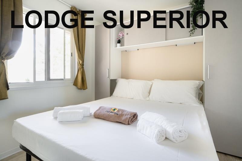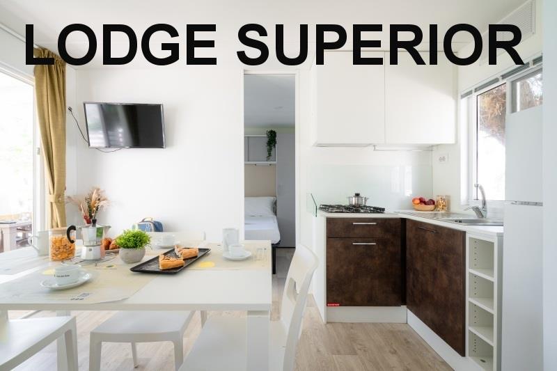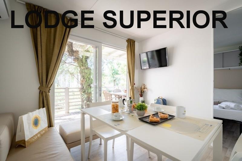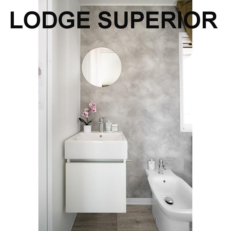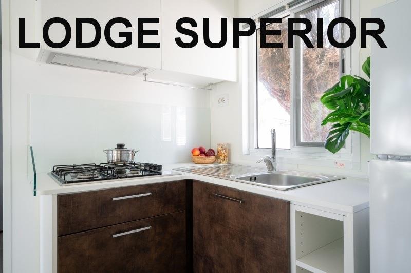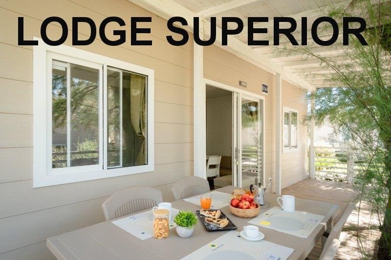 mobilhome Lodge Superior: ((maks. 4 osoby dorosłe + 1 dziecko do 10 lat, 140 cm/40 kg, 32 m2) sypialnia z łóżkiem małżeńskim, sypialnia z dwoma łóżkami i łóżkiem piętrowym nad nimi (odpowiednie dla dzieci, jest krótsze), pokój dzienny z częścią wypoczynkową i aneksem kuchennym, 2x przysznic+WC, klimatyzacja. Częściowo zadaszony drewniany taras z miejscem do siedzenia, taras zamykany drzwiami. Możliwy pobyt z psem.