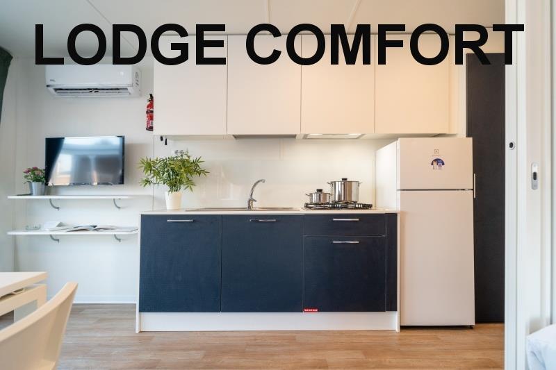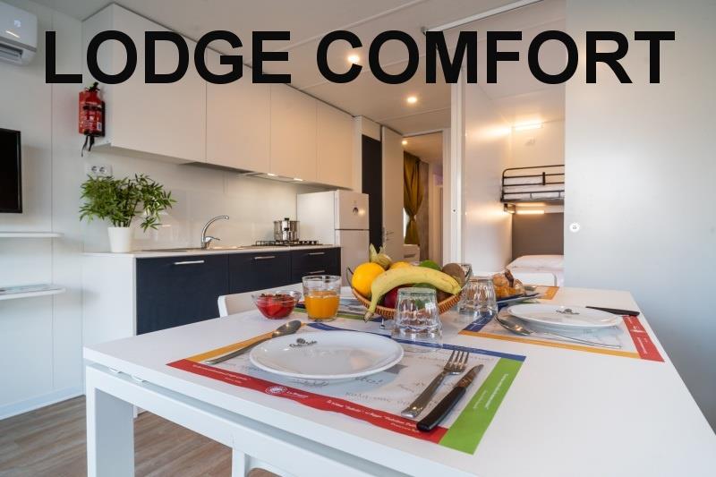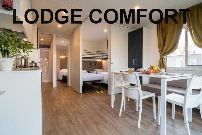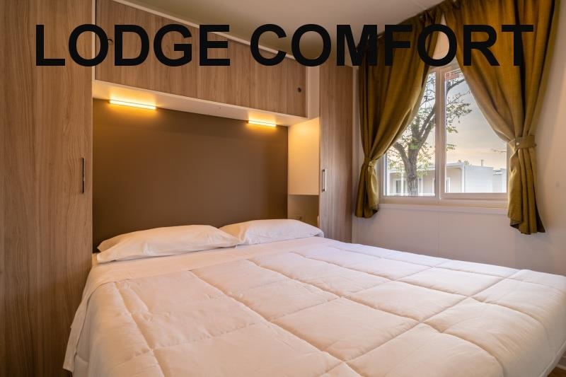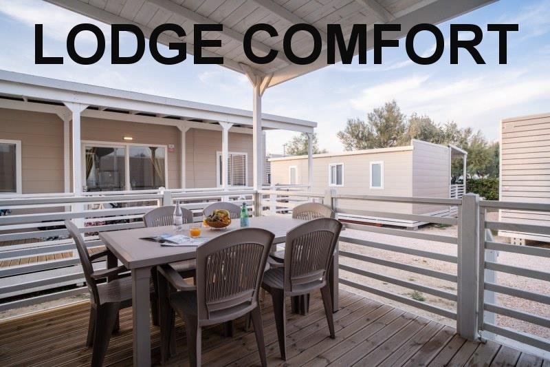 mobilhome Lodge Comfort: (maks. 4 osoby dorosłe + 1 dziecko do 10 lat, 140 cm/40 kg, 29 m2) sypialnia z łóżkiem małżeńskim, sypialnia z dwoma łóżkami i łóżkiem piętrowym (odpowiednie dla dzieci do 10 lat, ale krótsze), salon z kącikiem wypoczynkowym i aneksem kuchennym, łazienka z WC, klimatyzacja. Zadaszony, drewniany taras z miejscami do siedzenia.
