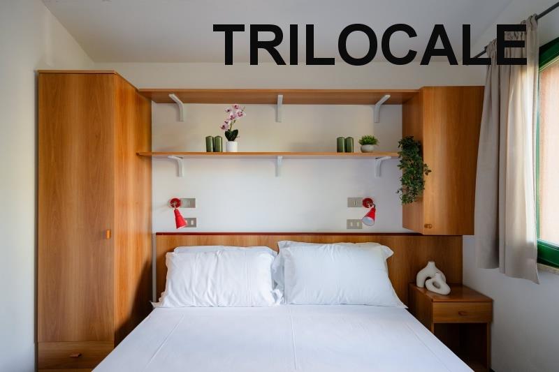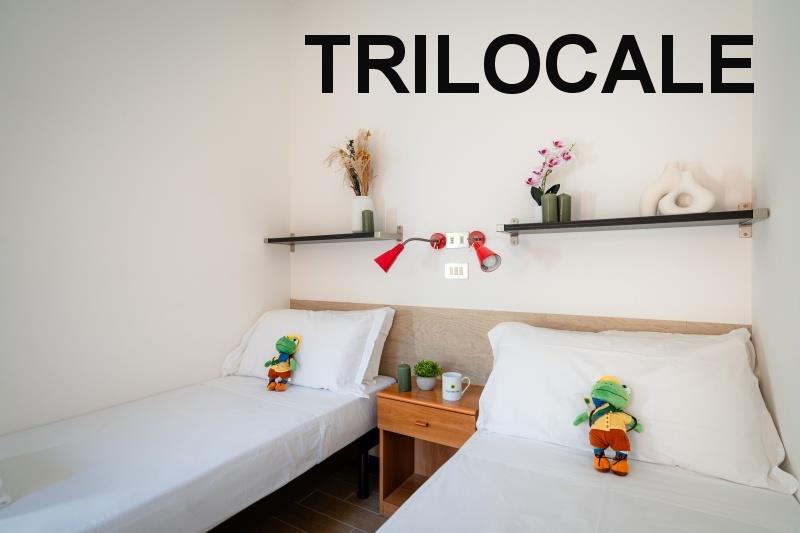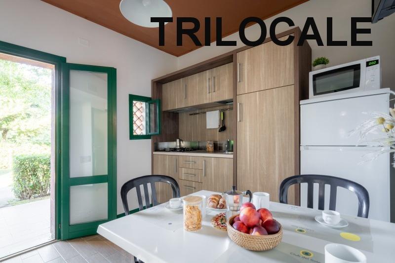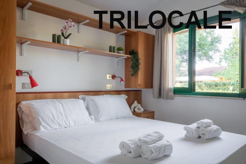 apartmán Trilocale Standard: (maks. 4 osoby, 50 m2) sypialnia z łóżkiem małżeńskim, sypialnia z dwoma pojedynczymi łóżkami, pokój dzienny z aneksem kuchennym, łazienka z prysznicem+WC+suszarka do włosów, klimatyzacja. Weranda z miejscem do siedzenia.