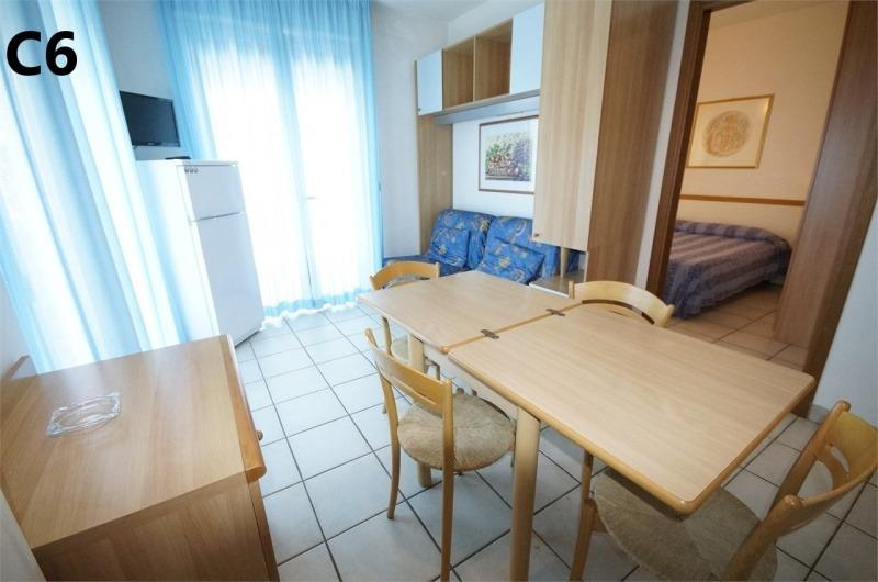 B5: (maks. 5 osob) sypialnia z dwoma łóżkami, pokój dzienny z boksem kuchennym i dwoma rozkładanymi łóżkami i składanym łóżkiem.