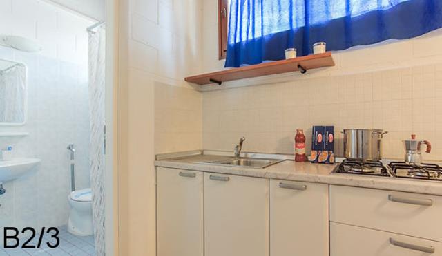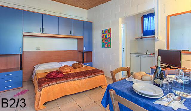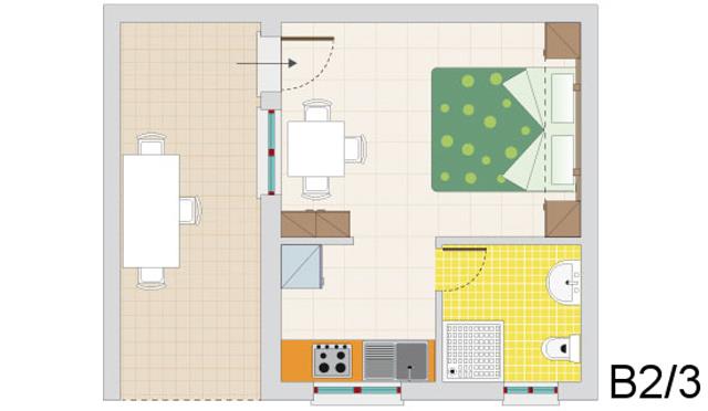 B2/3: (20 m2, maks. 3 osoby) studio (jedno pomieszczenie) z łóżkiem dwuosobowym, boks kuchenny. Możliwa dostawka dla 3. osoby (na żądanie podczas rezerwacji, za dopłatą).