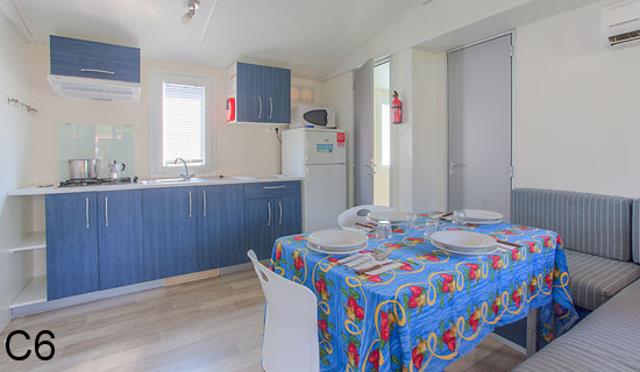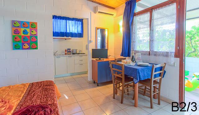 Zakwaterowanie: apartamenty w bungalowach B2/3, B4/5 i mobilhome C4, C5, C6 - są standardowo urządzone, zawsze z wyposażonym boksem kuchennym, prysznic+WC, kuchenka mikrofalowa, TV/SAT, klimatyzacja, taras z meblami ogrodowymi.