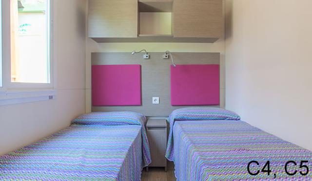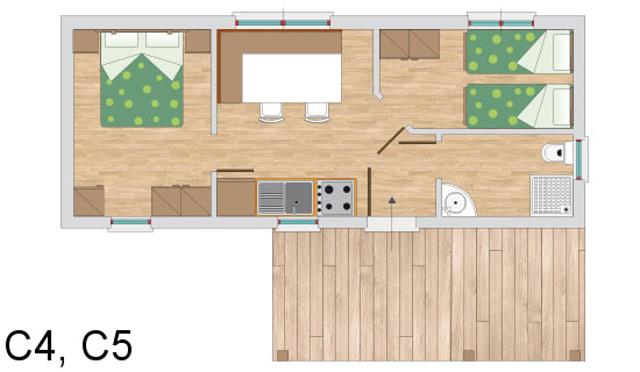 C4/5 PLUS: (30 m2, maks. 4/5 osób) sypialnia z łóżkiem małżeńskim (140x220 cm), sypialnia z dwoma łóżkami (70x185 cm), salon z aneksem kuchennym. Możliwość dostawki dla 5. osoby (ława w kuchni 70x185 cm).