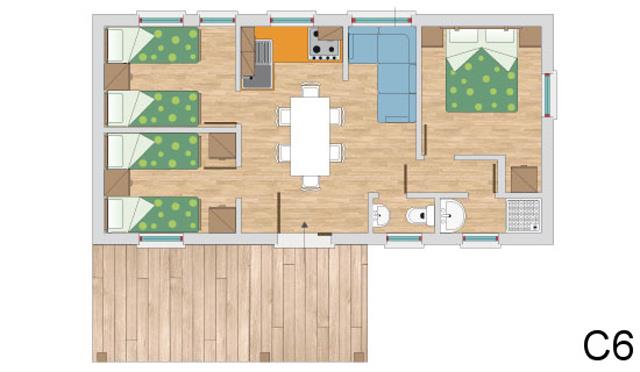 C6: (30 m2, maks. 6 osób) trzy sypialnie w każdej dwa łóżka, pokój dzienny z boksem kuchennym. Dodatkową osobą może być tylko dziecko do 1,5 roku.