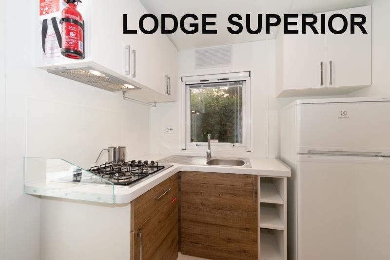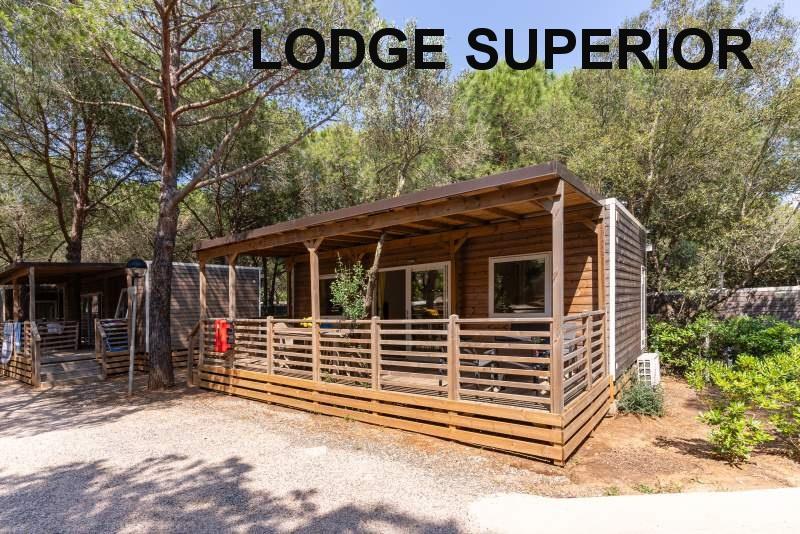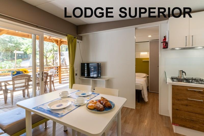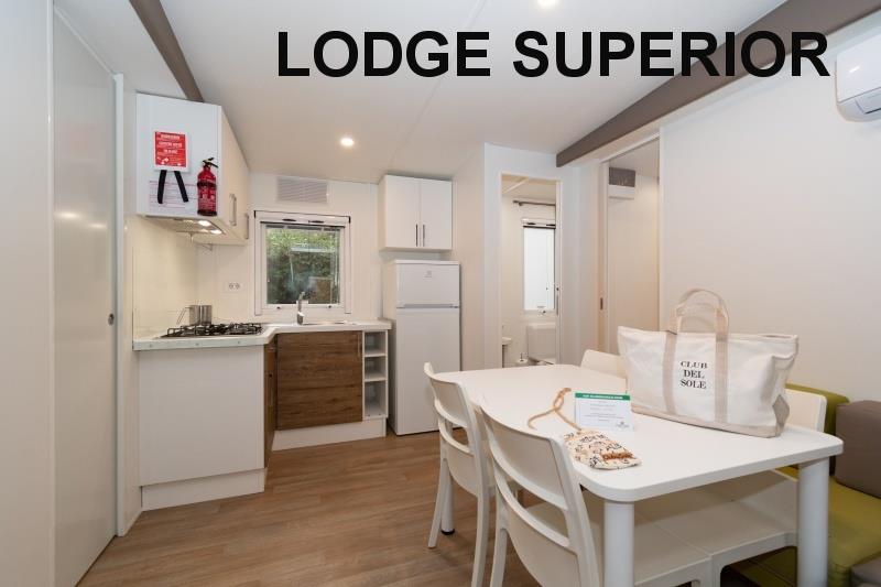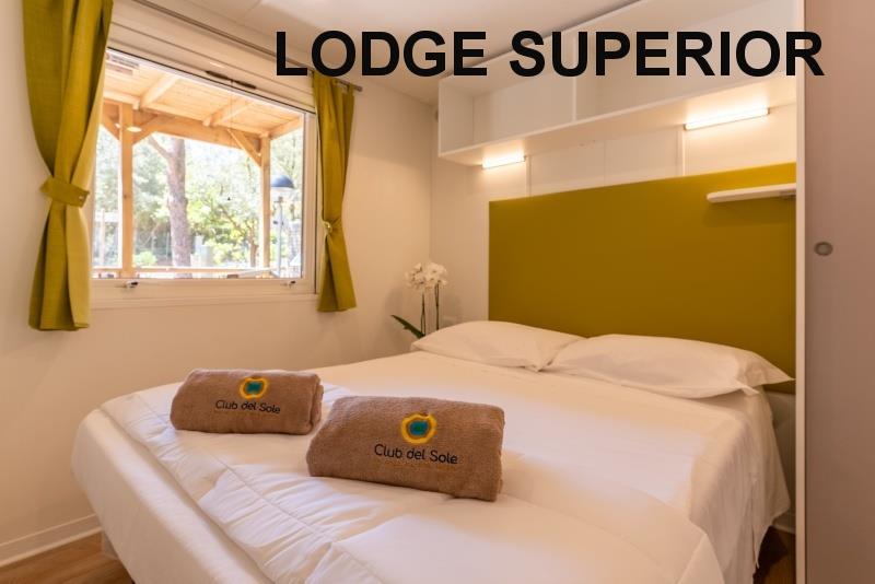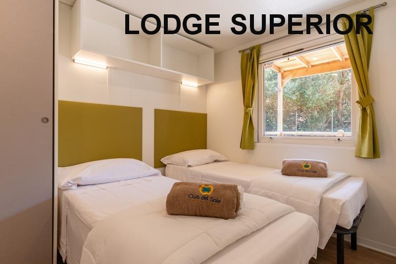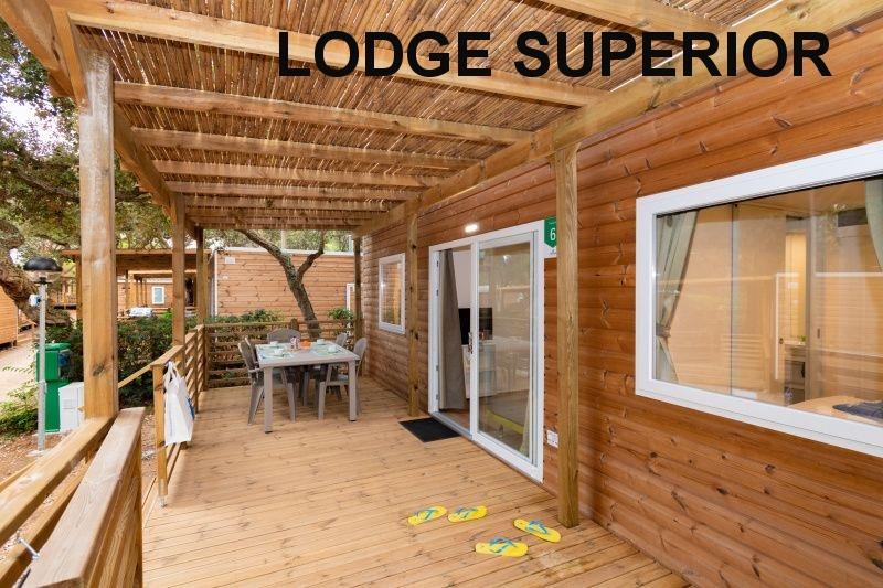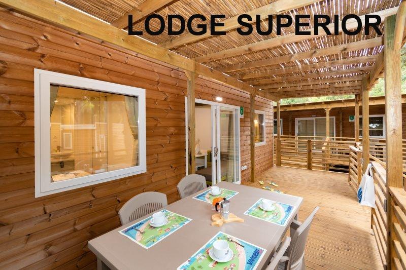 Lodge Superior: (maks. 4 osoby, 31 m2) sypialnia z łóżkiem małżeńskim, sypialnia z dwoma łóżkami, salon z kącikiem wypoczynkowym i aneksem kuchennym, 2 łazienki z WC, klimatyzacja. Zadaszony, drewniany taras z miejscami do siedzenia.