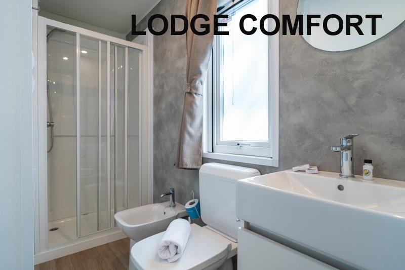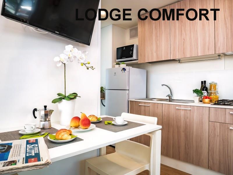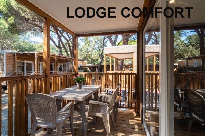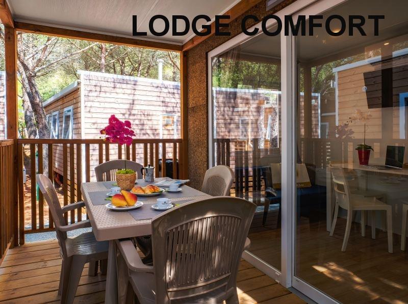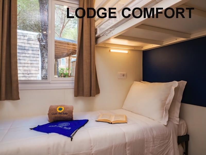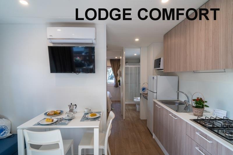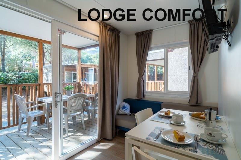 Lodge Comfort: (maks. 5 osób, 32 m2) sypialnia z łóżkiem małżeńskim, sypialnia z łóżkiem pojedynczym, łóżkiem wysuwanym i łóżkiem piętrowym, salon z kącikiem wypoczynkowym i aneksem kuchennym, łazienka+WC, klimatyzacja, zadaszony taras z kącikiem wypoczynkowym.