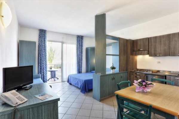 Charakterystyka: Wioska oferuje:winda,restauracja,pokój telewizyjny,bar,bar przy basenie,pokój spotkań,parking i komunikacja autobusowa (ok.08.06-07.09). Oferta wszystkich apartamentów:klimatyzowane,telefon,telewizja satelitarna,prysznic/WC, suszarka do włosów (w mieszkaniu jednopokojowym),sejf i balkon.\nA0: mono z balkonem w rezydencji\nA1: bilo Villetta z ogrodem i 1 oddzielną sypialnią\nA2: trilo z ogrodem i 2 oddzielnymi sypialniami