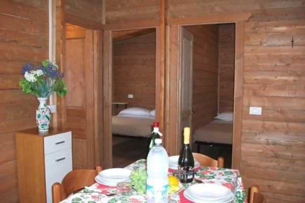 C6: (maks. 6 osób) sypialnia z łóżkiem dwuosobowym, sypialnia z dwoma łóżkami piętrowymi, pokój dzienny z boksem kuchennym, TV, prysznic+WC, klimatyzacja (za opłatą), weranda z meblami ogrodowymi.