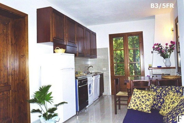 Erica (około 50 m2) - sypialnia z łóżkiem dwuosobowym i pojedynczym łóżkiem, pokój dzienny z rozkładanym łóżkiem dwuosobowym, boks kuchenny, zmywarka, toster, ekspres, prysznic+WC, pralka, altanka z meblami ogrodowymi. Apartament mieści się na parterze.