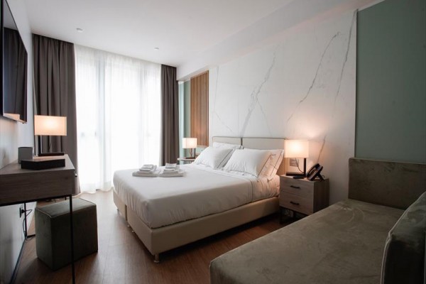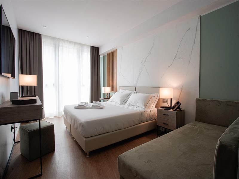 Apartament Junior Pokój dla 3 osób o powierzchni około 17 metrów kwadratowych, urządzony w eleganckim stylu i bardzo przestronny, wyposażony we wszelkie udogodnienia, w tym klimatyzację, sejf, Wi-Fi, telefon, telewizję satelitarną, minibar, łazienkę z prysznicem, bezpłatne przybory toaletowe i suszarkę do włosów.