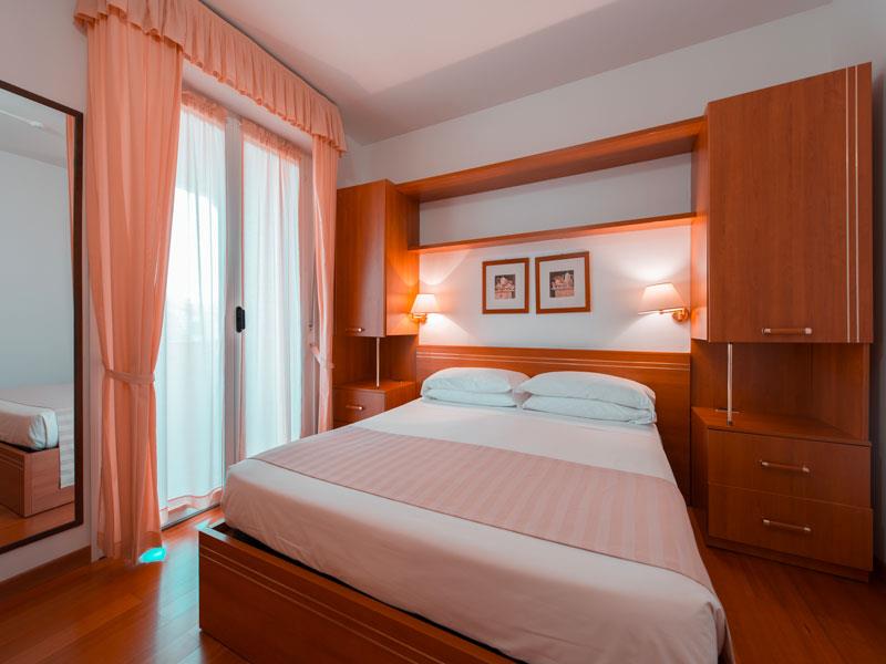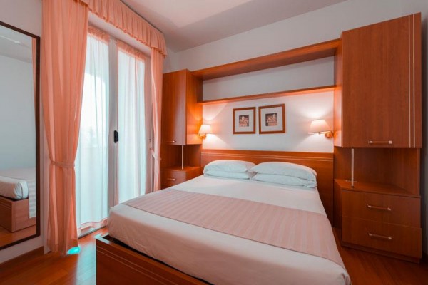 POKÓJ CZTEROOSOBOWY SUPERIOR Około 40 metrów kwadratowych, składający się z salonu z podwójną rozkładaną sofą, sypialni z łóżkiem małżeńskim oraz drugiej sypialni z podwójną rozkładaną sofą. Niektóre apartamenty posiadają rozkładany aneks kuchenny, dostępny tylko na życzenie w momencie rezerwacji i za dodatkową opłatą. Podłoga wyłożona parkietem. Do dyspozycji jest balkon ze stołem i krzesłami.