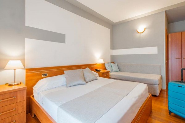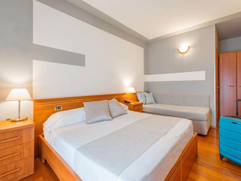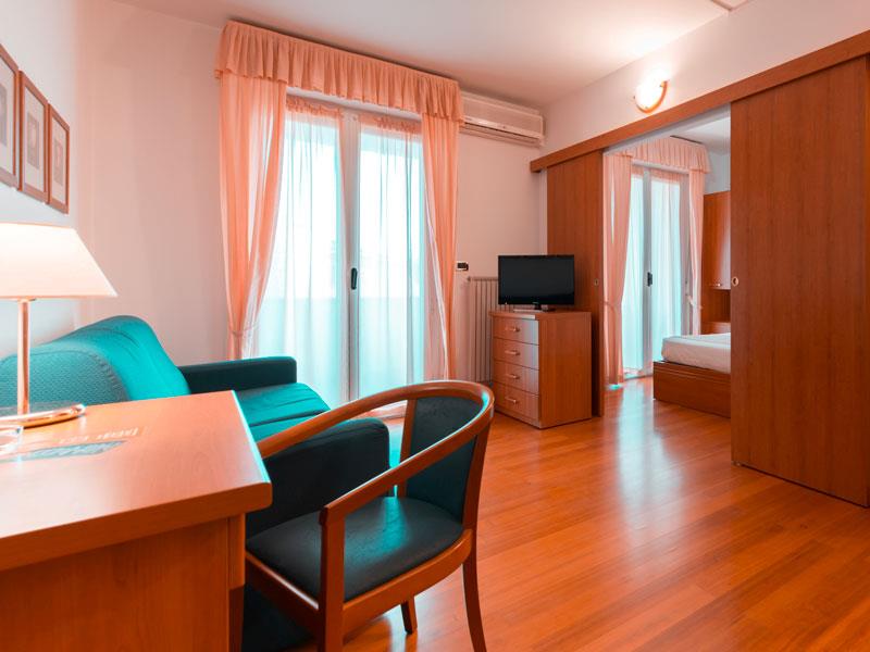 JUNIOR SUITE 3 OSOBY Ten typ pokoju ma powierzchnię około 22 metrów kwadratowych i jest odpowiedni dla 3 osób (wliczając dzieci i niemowlęta). Wyposażony jest w parkiet, łóżko podwójne i łóżko pojedyncze, prywatną łazienkę z prysznicem i suszarką do włosów oraz balkon ze stołem i krzesłami. Niektóre pokoje Junior mogą posiadać praktyczny, składany aneks kuchenny, z którego można korzystać wyłącznie na życzenie, w momencie rezerwacji i za dodatkową opłatą.