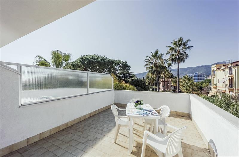 APARTAMENT TRZYPOKOJOWY 6 OSÓB Trzypokojowy apartament dla 6 osób, o powierzchni około 50/52 metrów kwadratowych, składający się z pokoju dwuosobowego, salonu z rozkładaną sofą dwuosobową lub dwoma pojedynczymi, aneksu kuchennego i dwóch łazienek. Druga sypialnia z antresolą, do której prowadzą schody (bez drzwi), wyposażona jest w dwa łóżka. Wszystkie pokoje mają taras lub balkon.