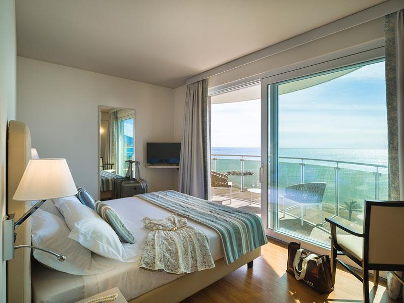Pokój dwuosobowy typu classic z balkonem i widokiem na morze Pokój z widokiem na morze o powierzchni około 18 metrów kwadratowych, urządzony w nowoczesnym i eleganckim stylu, wyposażony we wszelkie udogodnienia i umeblowany balkon. W pokoju znajduje się łazienka, sejf, suszarka do włosów, kolorowy telewizor, Wi-Fi, klimatyzacja i minibar.