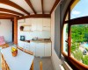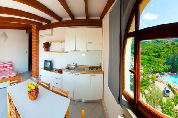 DOM MOBILNY Ten typ apartamentu to wygodny, funkcjonalny i starannie urządzony dom mobilny z 2 sypialniami, jedną z łóżkiem podwójnym i jedną z 2 pojedynczymi łóżkami, łazienką z kabiną prysznicową oraz salonem z w pełni wyposażonym aneksem kuchennym. Na zewnątrz, na drewnianej werandzie ze stołem i krzesłami, goście mogą delektować się posiłkami w otoczeniu zieleni. Apartamenty znajdują się w różnych miejscach na terenie kempingu.