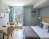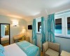 JUNIOR SUITE 2 OSOBY Ten typ łóżka wyposażony jest w panoramiczny taras i emanuje pięknem i atmosferą Portovenere. Szafy, biurka i stoliki nocne, wykonane na zamówienie, zostały zaprojektowane w duchu lat sześćdziesiątych, szczególnie owocnego okresu dla włoskiej produkcji. Zagłówki, również wykonane na zamówienie, zdobią sześciokątny motyw i tkana tkanina w odcieniach morskiego błękitu. Wyposażone są w telefon z bezpośrednim wyjściem, klimatyzację, minibar, suszarkę do włosów i tacę powitalną.