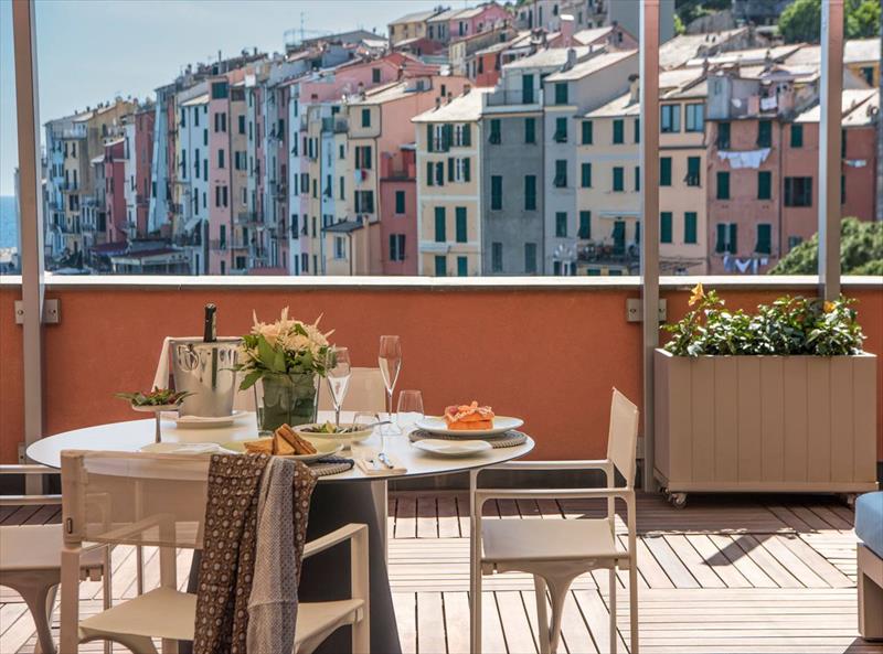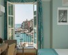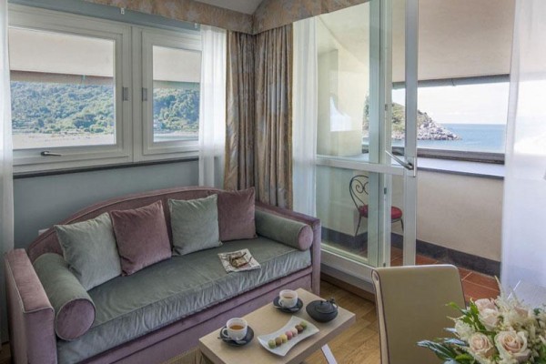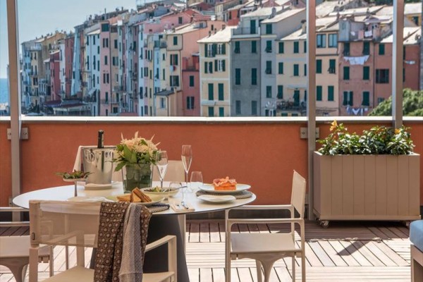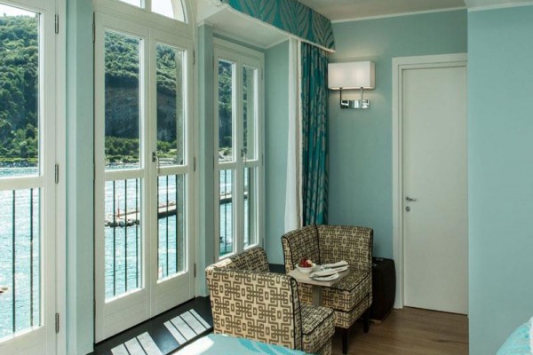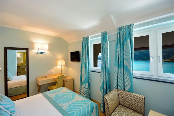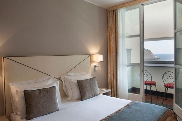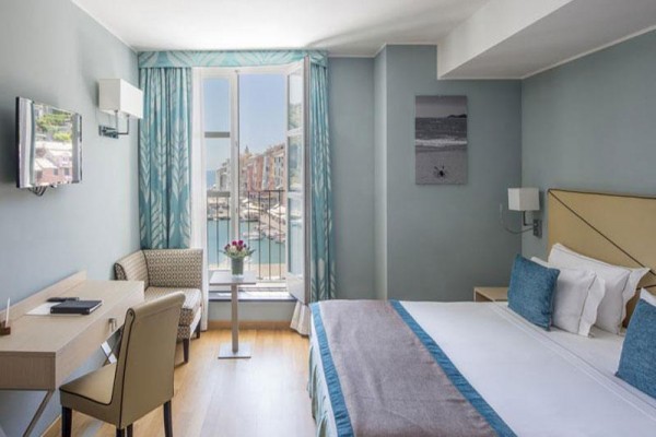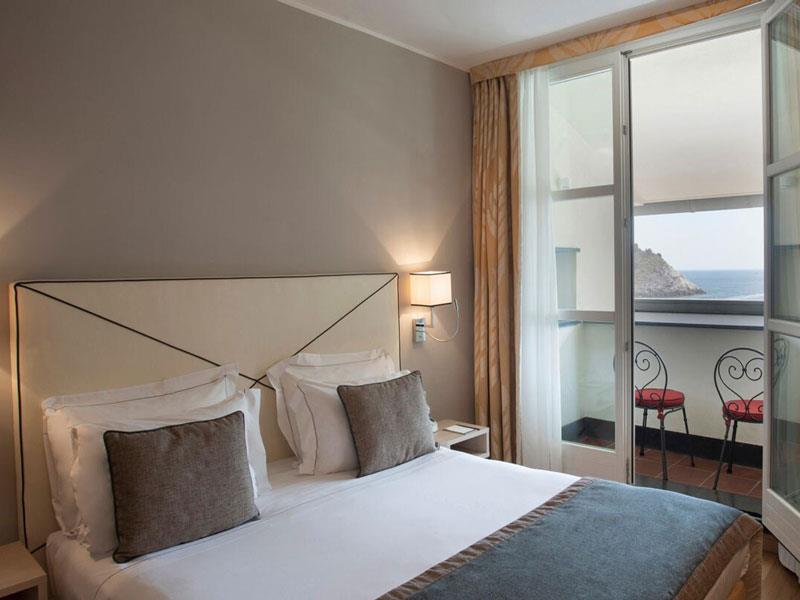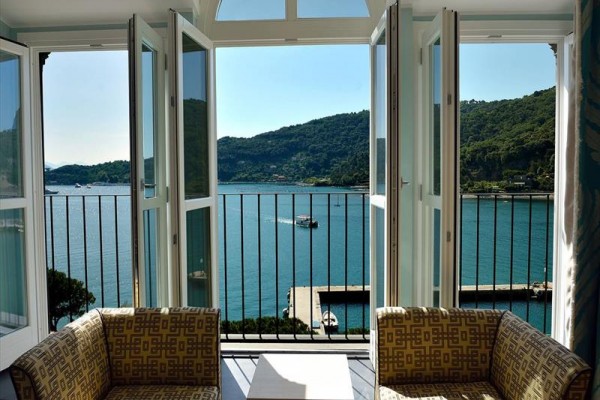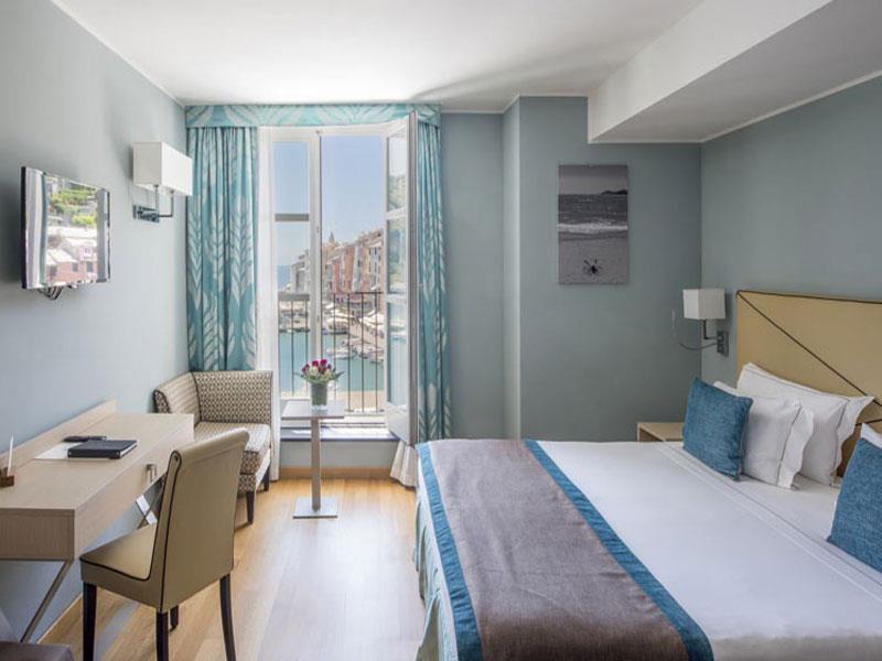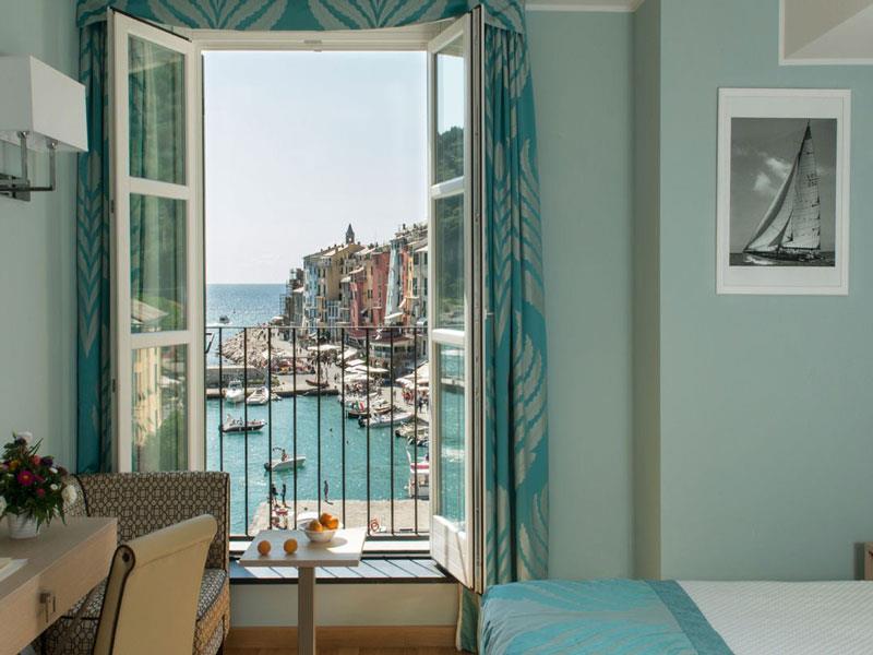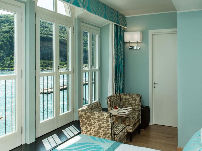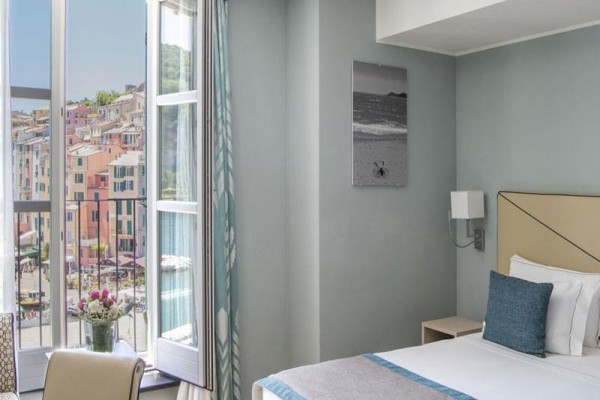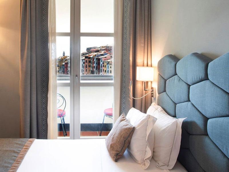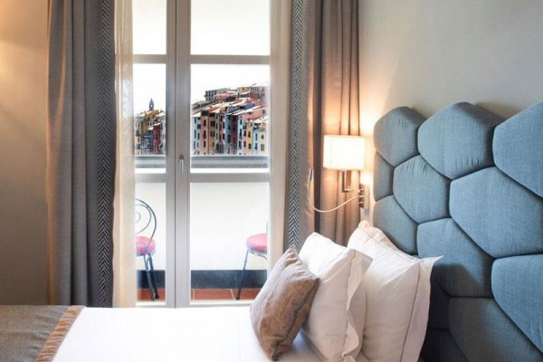 Pokój dwuosobowy typu de luxe z widokiem na morze Pokoje Deluxe, zlokalizowane w całym naszym zabytkowym budynku, są jasne i wyposażone w duże okna. Z okien roztacza się widok na wyspę Palmaria lub zamek i okoliczne wzgórza Portovenere. Każdy pokój Deluxe charakteryzuje się unikalnymi elementami architektonicznymi, a niektóre dysponują tarasem lub balkonem. Cenne i nowoczesne faktury przeplatają się ze sobą, znajdując swój maksymalny wyraz w detalach. Duże okna pozwalają, aby kolory ścian odbijały niebo i jego różnorodne odcienie, tworząc symbiotyczną relację z naturalnym otoczeniem. Pokoje wyposażone są w telefon z bezpośrednim wyjściem, klimatyzację, minibar, suszarkę do włosów i tacę powitalną.