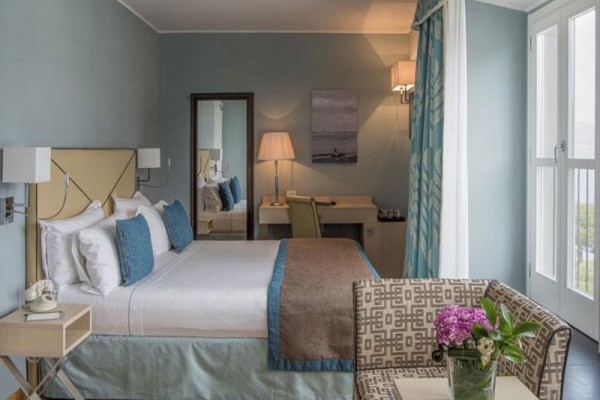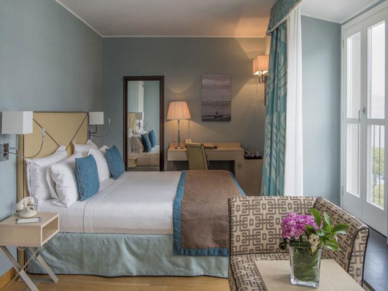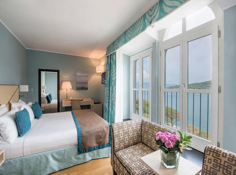 Pokój dwuosobowy typu Executive z widokiem na morze Każdy pokój Executive z widokiem na morze oferuje wyjątkową przestrzeń i marmurową łazienkę. Tylko niektóre pokoje dysponują niewielkim tarasem lub balkonem. Drewno na podłodze nadaje ciepły charakter i wyraźnie nawiązuje do pokrycia łodzi pływających wokół Portovenere i jego ukrytych zatok. Doskonałe materiały i wyrafinowane detale tych pokoi podkreślają walory krajobrazu zewnętrznego. Pokoje wyposażone są w łazienkę z wanną, telefon z bezpośrednim wyjściem na miasto, klimatyzację, minibar, suszarkę do włosów i tacę powitalną.