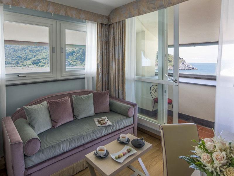 Pracownia Skryptoriów Pokój składa się z dwóch oddzielnych części. W salonie znajduje się rozkładana sofa i biurko, nawiązujące do skryptorium starożytnego klasztoru. Panel ścienny biurka w pastelowych kolorach nawiązuje do motywów wybranych mebli. Z pokoi narożnych roztacza się urzekający widok na Zatokę Poetów i jej perły, takie jak Lerici, Tellaro i Alpy Apuańskie w tle. W pokoju znajduje się telefon z bezpośrednim wyjściem na miasto, klimatyzacja, minibar, suszarka do włosów i taca powitalna.